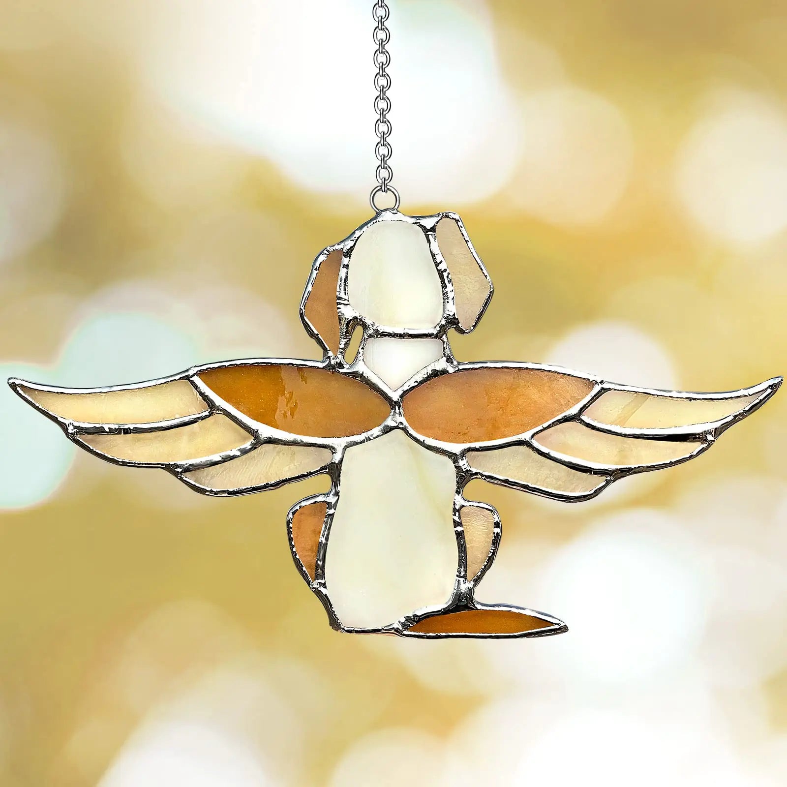 Honor the memory of a beloved companion with this beautifully crafted stained glass angel dog sun catcher. Designed to bring comfort, light, and love into any space, this delicate piece serves as a lasting tribute to a furry friend who left paw prints on your heart.
